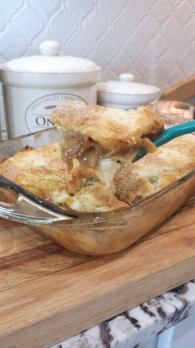 - Spread the cobbler topping evenly over the apples in the dish. You can drop scoops of batter over the apples and spread it out.