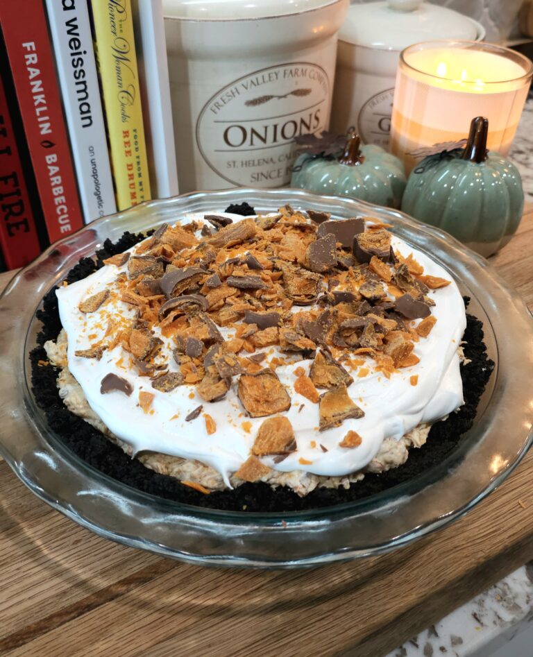 This recipe is for a rich and decadent Butterfinger pie that features a no-bake Oreo crust and a creamy peanut butter filling loaded with Butterfinger candy pieces. It’s topped with whipped cream and more crushed Butterfingers for an indulgent finish. Here’s a detailed breakdown of how to make