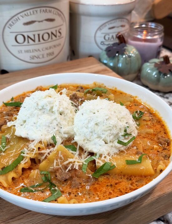 This lasagna soup is a hearty and comforting twist on classic lasagna, offering all the rich, savory flavors in a convenient one-pot meal. Ground beef and pork are seasoned and simmered with garlic, onions, bell pepper, mushrooms, and a blend of Italian herbs, creating a robust