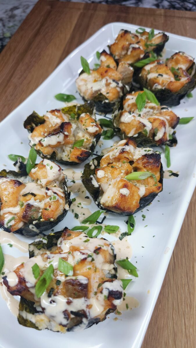 - Drizzle the spicy mayo over the salmon bites. You can also sprinkle with rice seasoning if desired and garnish with sliced green onions.