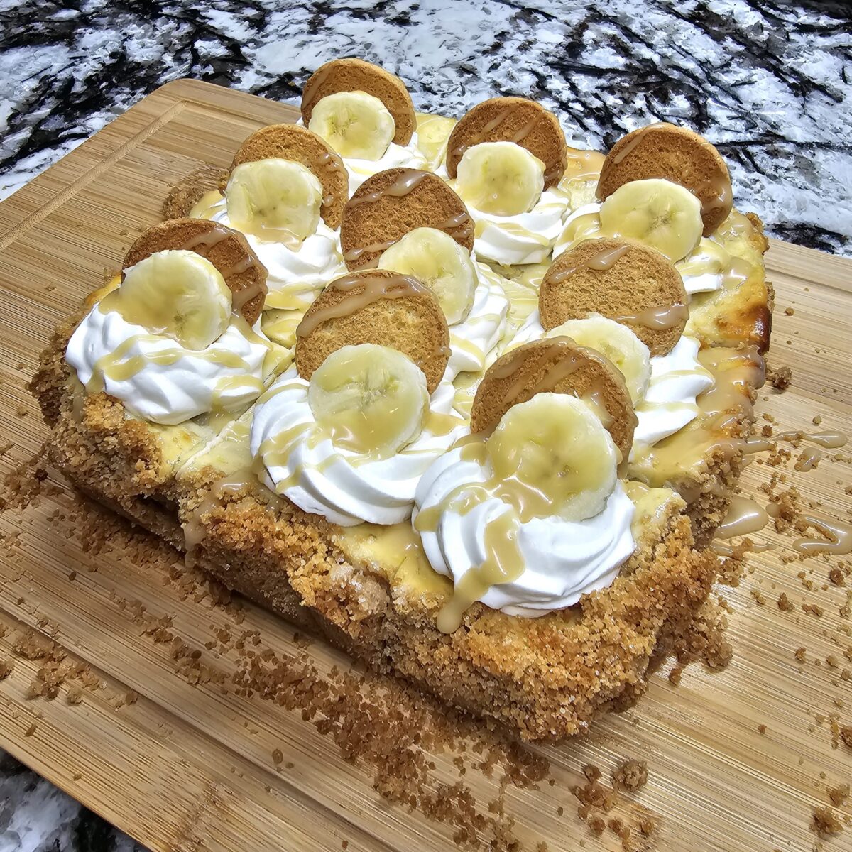 1. Cut into portion size squares. Top with homemade whipped cream, sliced bananas, whole vanilla wafers, drizzle of the caramel sauce, and a sprinkle of crushed vanilla wafers.