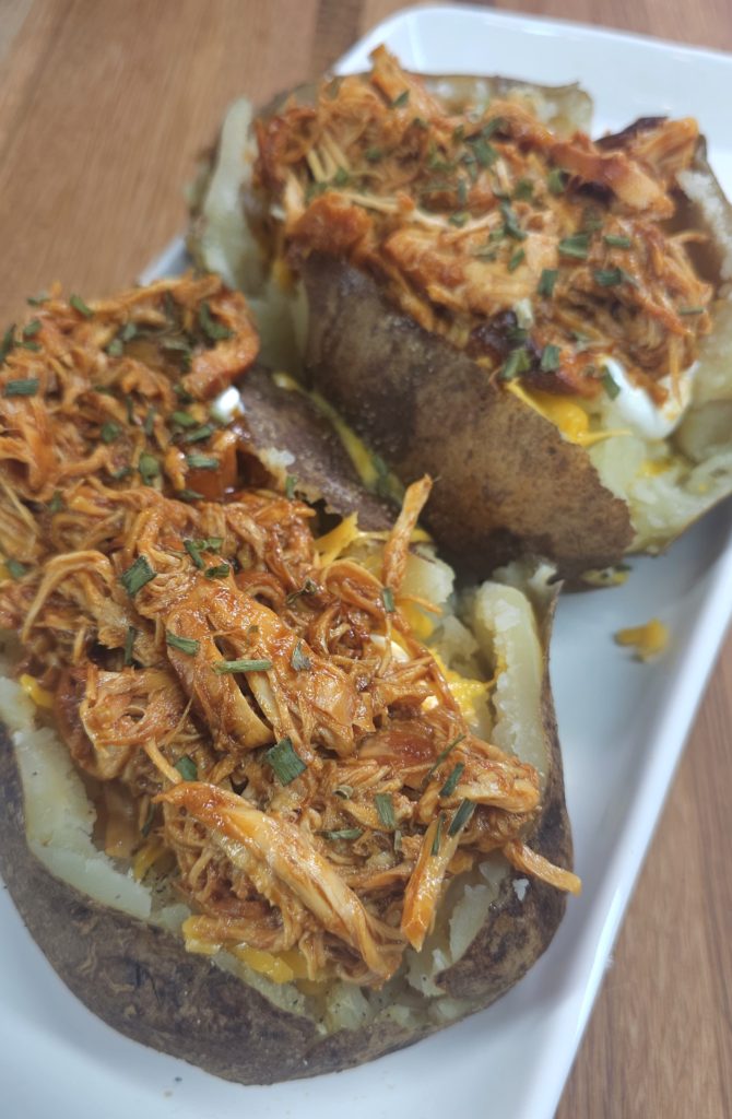 Crockpot BBQ Pulled Chicken Stuffed Baked Potatoes