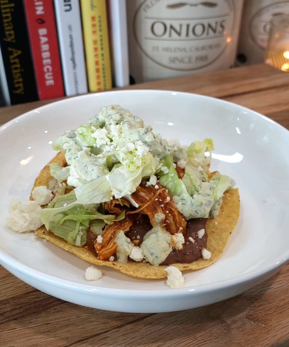 - Top with chicken, lettuce, tomatoes, and Cotija cheese.