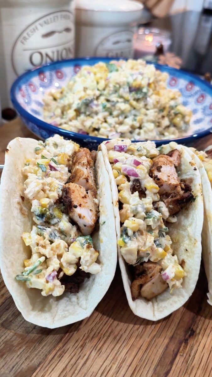 The salad combines charred corn and poblano peppers with a creamy mix of mayo, sour cream, lime juice, and pepper jack cheese, creating a tangy and smoky accompaniment. This colorful salad, with its blend of sweetness from the corn and heat from the poblanos, adds a vibrant contrast to the grilled chicken. Served with warm, charred flour tortillas, this dish is ideal for a summer barbecue or a special dinner, providing a satisfying balance of smoky, spicy, and creamy flavors in every bite.