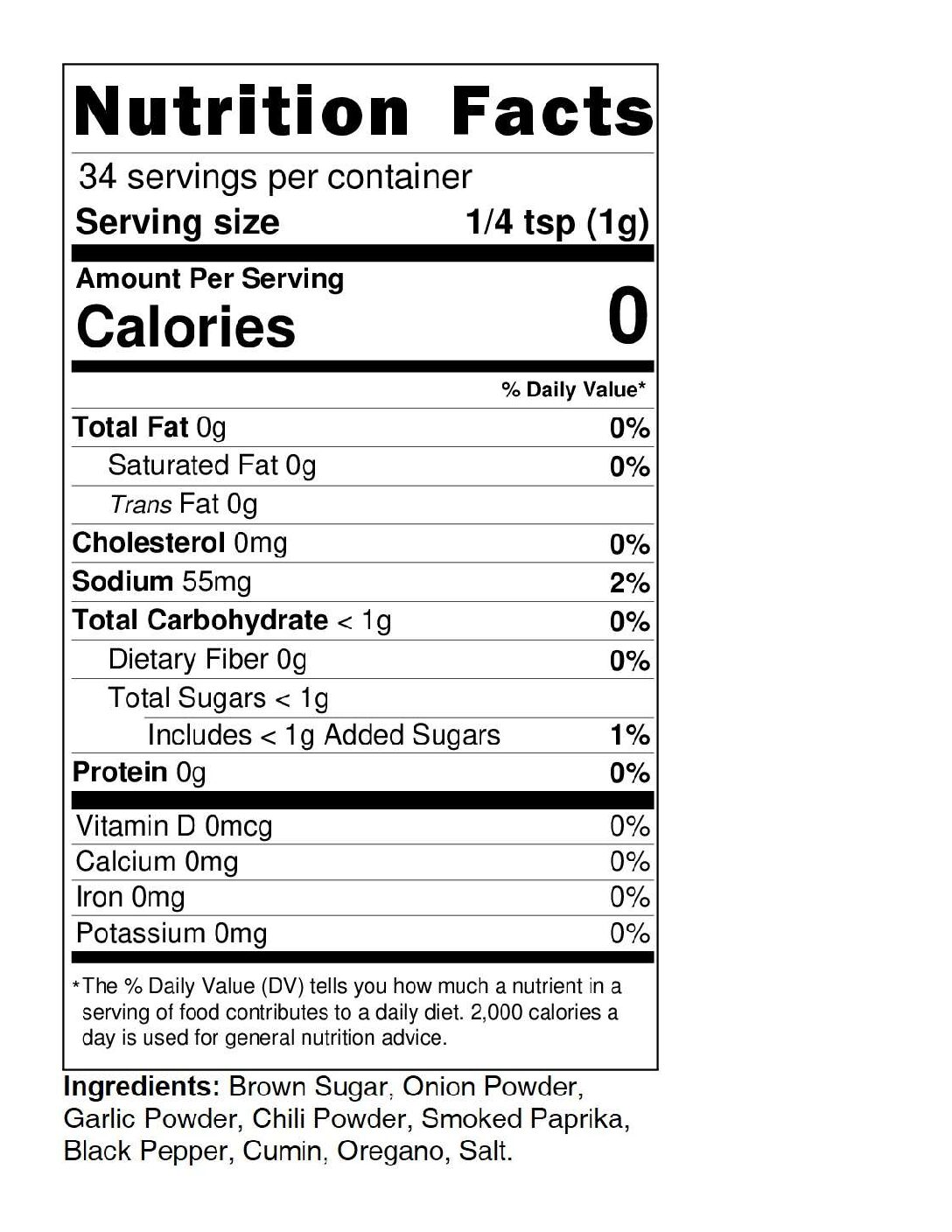 A bold, low-sodium chicken seasoning that doubles as a Tex-Mex taco seasoning and fajita seasoning, delivering smoky flavor to chicken, beef, pork, veggies, and more. Only 55 mg sodium per serving.