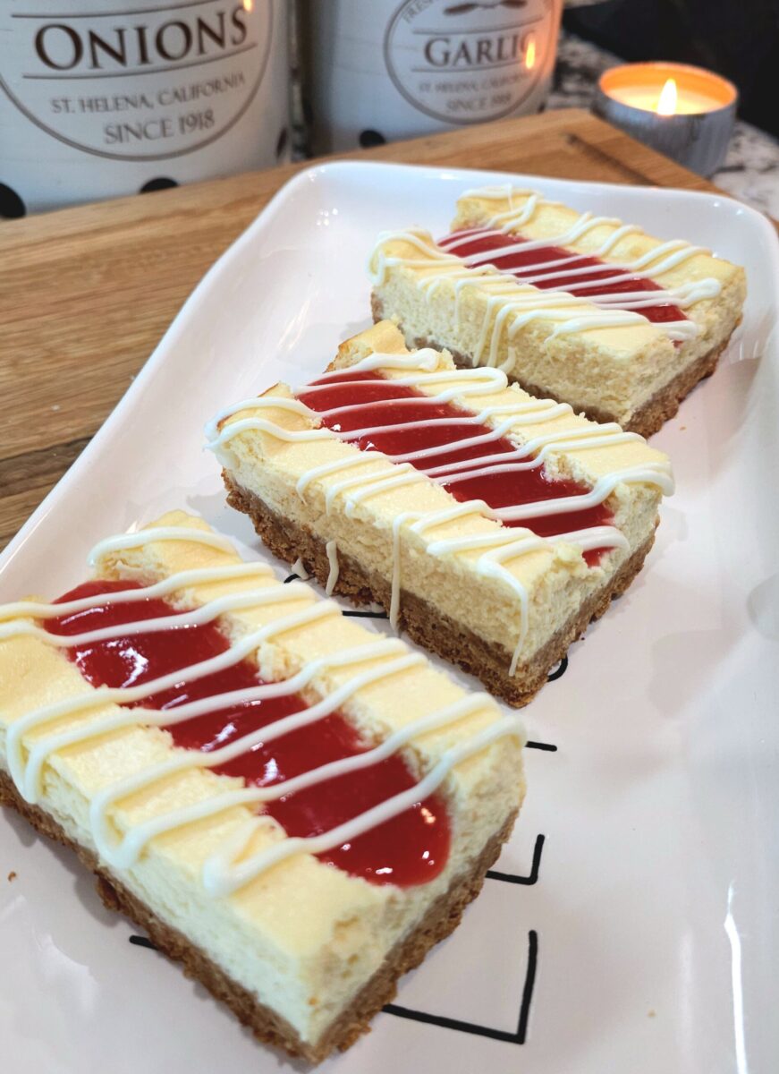 After the cheesecake chill (step 8) you can cut the bars into half or thirds for a bite size serving. Drizzle with white chocolate after cutting. Clean knife in-between cuts for a clean cut.