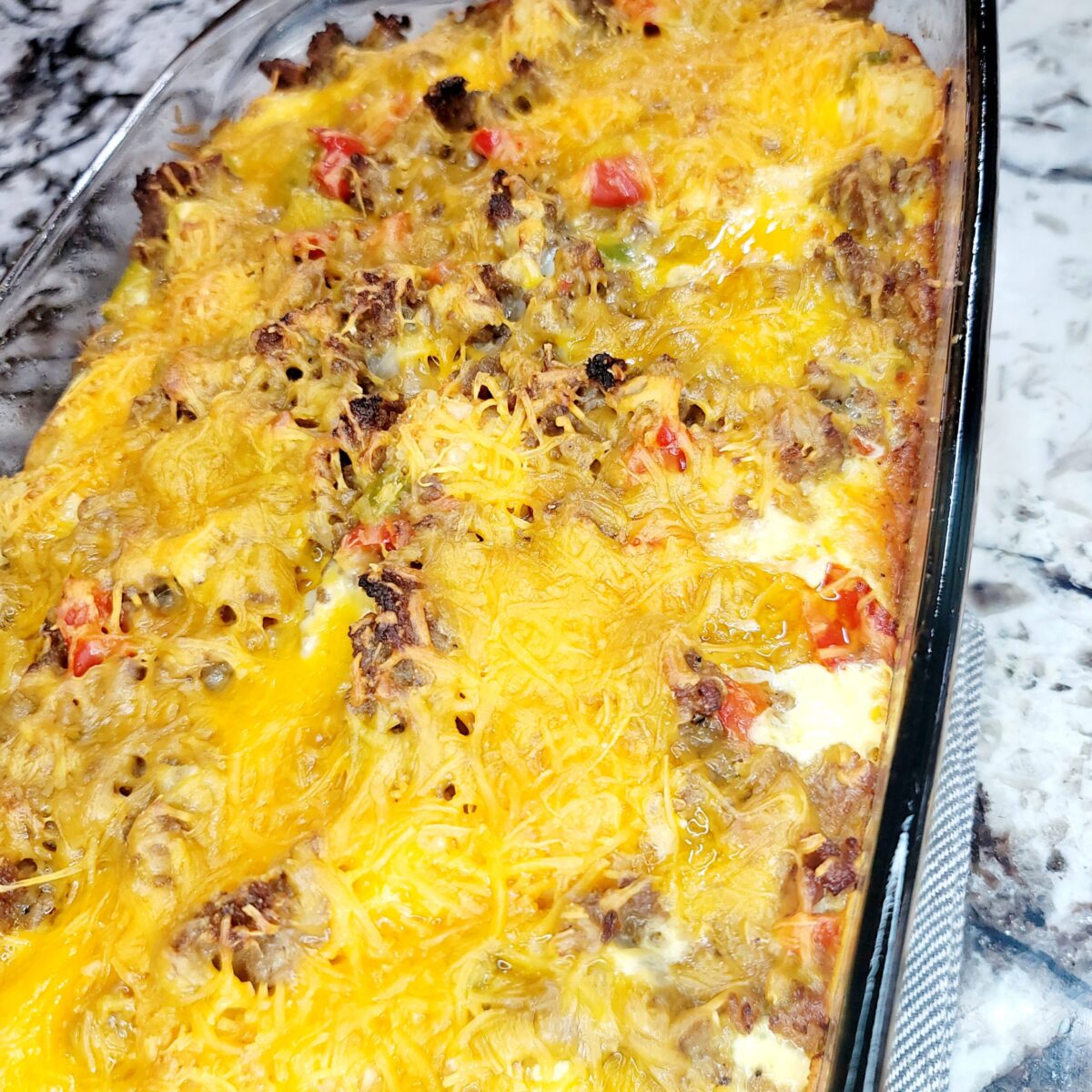- Add all of the frozen Tater tots to the 9×13. Using a slotted spoon, add cooked sausage and vegetables. Top with the egg/milk mixture and sharp cheddar cheese. Bake in the oven for 60-70 minutes, uncovered.